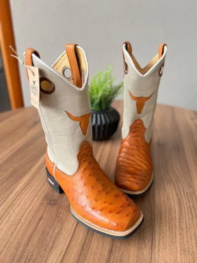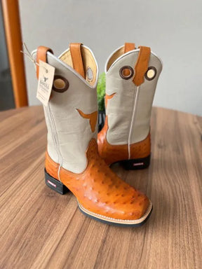 Texana Lucca - Couro Off-White e Avestruz/ Bordado Touro Caramelo